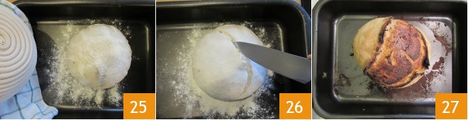 and without burning yourself, also remove the baking sheet from the oven. Lightly sprinkle the baking sheet with some flour and place the cold dough on it. Lightly dust the surface of the bread with flour and make a cut using a sharp blade 26. Bake in the oven for about 45 minutes at 482°F. Then remove from the oven 27 and let it cool slightly before cutting and serving it.