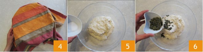 Cover with a dish towel 4 and let it rest for about 15 minutes. Then add the salt 5 and pumpkin seeds 6.