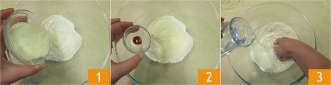 To prepare bread with sourdough starter, start with the dough. Pour the all-purpose flour and semolina into a bowl 1, add the malt 2, and slowly pour in the room temperature water while beginning to knead with your hands 3.