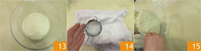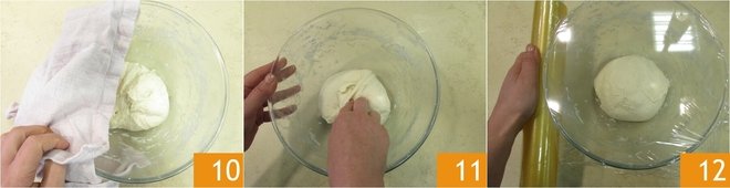 Cover with a cloth 10 and let rest for 15-20 minutes. Repeat these operations 3 more times 11, making 4 rounds of folds. You will notice that the dough becomes very smooth. Cover with plastic wrap 12 and let rise for 3 hours at room temperature.