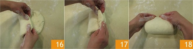Flatten it slightly to form a disc 16. Then make a three-fold, bringing one side of the dough towards the center first 16 and then do the same with the other 17. Pinch gently to adhere the dough and rotate it so the seam goes downward 18.