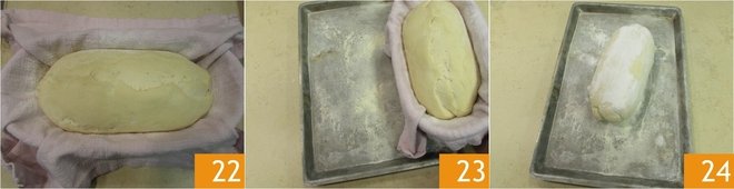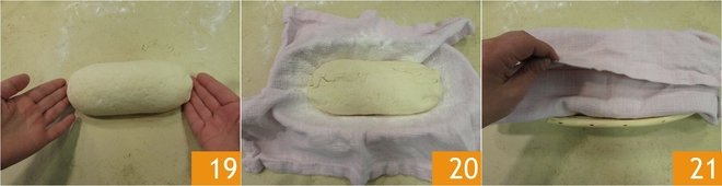 Stretch it gently to form a loaf 19. Then transfer it to the bread basket, this time placing the opening upward 20. Cover with the cloth 21 and let rise for another 2-3 hours.