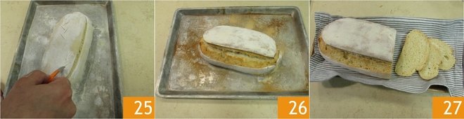 and with a sharp blade, make a lengthwise cut along the entire length of the bread 25. At this point, bake the bread in a preheated oven at 437°F in static mode, add 10 ice cubes to the bottom of the oven, which when melted will release the right humidity, and bake for 20 minutes. Then switch to ventilated mode and bake the bread for another 10 minutes. Remove then the sourdough bread 26, transfer it to a rack and let it cool before serving 27.
