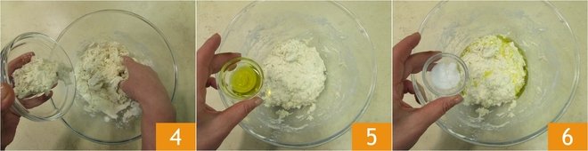 When the water is absorbed, add the sourdough starter, refreshed the day before and in any case at least 5 hours prior 4. Continue to knead. Add the oil 5 and salt 6.