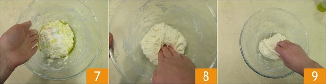 Work again with your hands 7 until you get a homogeneous mixture. Cover with a cloth and let rest for 15-20 minutes. Now make the first round of folds. Take a piece of the dough, lift it gently, and bring it toward the center 8. Rotate the bowl 9 and repeat this operation. Continue in this way until you have picked up all the outer pieces of the dough, having completely rotated the bowl.