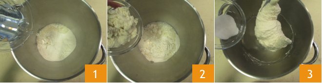To prepare sourdough pizza, first, make the dough. In a stand mixer bowl fitted with a dough hook, add the flour, room temperature water 1, and room temperature sourdough 2. Mix with the hook on low speed until a smooth and homogeneous mixture is obtained. Then add the salt to the dough 3