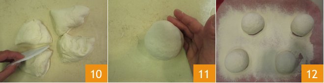 transfer it to a surface, and using a bench scraper, divide it into 4 equal parts 10. Gently work each portion with your hands and shape each into a tight, firm sphere 11. Place them on a well-floured tray, spacing the balls well apart. Dust with more flour 12 and cover the tray with plastic wrap. Let the dough balls rise (proof) for 1 hour at about 77°F, then transfer them to the fridge for 12 hours. At this point, remove the tray from the fridge and let it sit at room temperature for an hour.