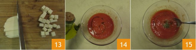 In the meantime, prepare the topping: cut the mozzarella into 1 cm (0.4 inch) cubes 13 and store in the fridge. Pour the tomato puree into a bowl: add salt, a drizzle of oil 14, a bit of dried oregano 15, and mix.