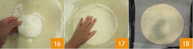Take one of the dough balls and transfer it to a well-floured surface 16. Press the dough with your fingers in the center, then gently rotate it with your hands on the surface to form the edge. Stretch it so that the center is thinner than the edge 17. Transfer to a baking sheet lined with parchment paper 18, or well-floured,