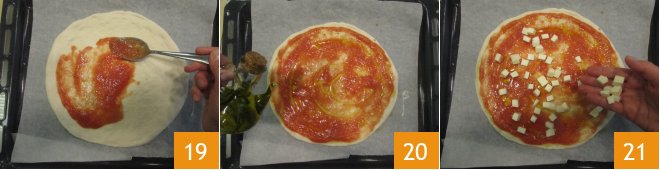 Using a spoon, spread some tomato puree over the entire surface, leaving the edge clean 19. Add a drizzle of oil 20 and the mozzarella cubes 21.