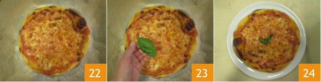 Bake in a preheated static oven at 482°F for 10 minutes, on the top rack. Take the pizza out of the oven 22, add a basil leaf 23, and serve immediately 24!