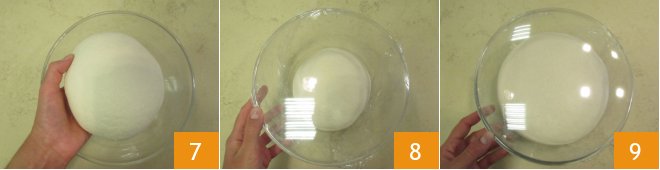 Transfer the dough to a bowl 7 and cover with plastic wrap 8. Let it rise for 5 hours at about 77°F away from drafts. After the 5-hour rise, take the risen dough 9