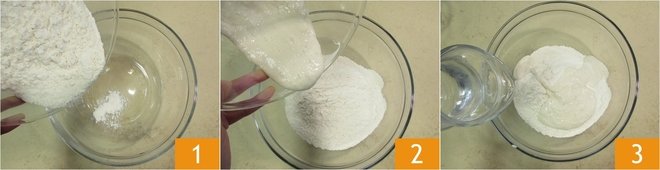 To prepare the sourdough rolls, start with the dough: pour the flour 1, the refreshed and doubled starter 2, and half of the water 3 into a large bowl.