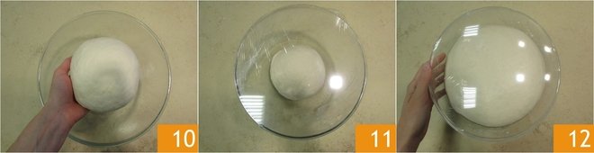 Place it in a bowl previously brushed with oil 10, cover with plastic wrap 11, and let it rise for at least 12 hours at a temperature of 70-73°F 12.
