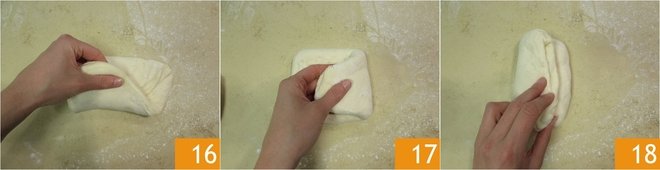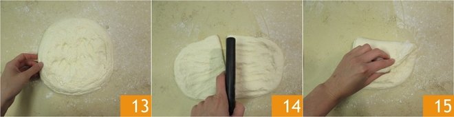 After the necessary time, transfer the dough onto a lightly floured work surface, gently spread it out 13, and divide it in two 14. Take the first piece and fold the top edge towards the center 15.
