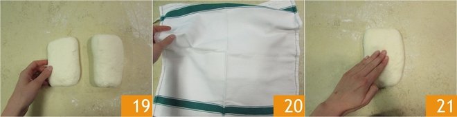 Do the same for the second piece 19, cover with a cloth 20, and let it rest for 30 minutes. Give four more folds to each and let it rest covered with a cloth for about 30 minutes. After the necessary time, take one of the pieces and flatten it slightly with your hands 21.