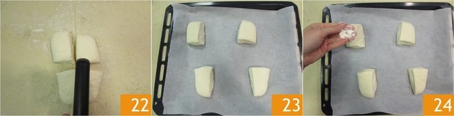 Cut it into four equal parts and transfer the rolls onto a baking sheet lined with parchment paper, spacing them well. Let them rise for an hour 23, then take a little flour and sprinkle it over the rolls 23.