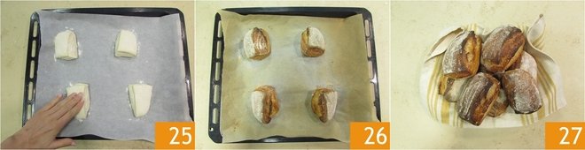 Then gently remove the excess flour by brushing it off with your hand 24. Bake the sourdough rolls in a preheated static oven at 464°F, placing a small tray of water at the bottom of the oven. Bake for about 40 minutes, then take them out 26 and let them cool before serving 27.