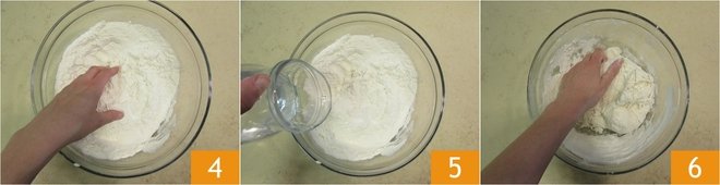 Begin kneading with your hands 4, then add the remaining water 5 and knead again with your hands 6.
