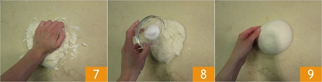When the water is absorbed, transfer the dough onto a work surface and continue kneading 7 until you have a smooth and elastic dough. At this point, add the salt 8 and continue kneading vigorously for at least 10 minutes until the dough is smooth 9.