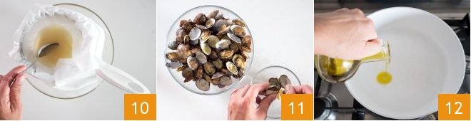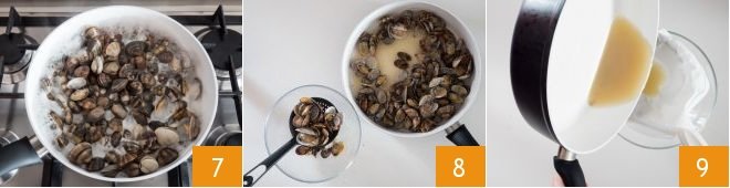Put the clams in a pan, cover with a lid, and cook over high heat for about 5 minutes, the time needed for the shells to open 7. Using a slotted spoon, transfer the clams to a bowl 8. Take a fine-meshed strainer and line it with absorbent paper or a thin cloth. Pour the cooking juices into the strainer 9,