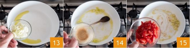 add the spring onion 13 and ginger 14 and let them sauté for a few minutes over moderate heat, then add the cherry tomatoes 15.