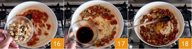 Then add the shelled clams 16 and deglaze with 1.5 tablespoons of soy sauce 17. Turn off the heat and set aside 18.