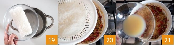Bring the pot with the boiling water back to the stove, add the soybean spaghetti, off the heat 19, and let them soak for about 3 minutes. At this point, drain the soybean spaghetti directly into the sauce 20, add the clam cooking water 21
