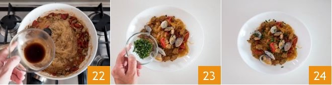 and the remaining soy sauce 22. Sauté in the pan for another couple of minutes and turn off the heat. Plate, finish with the chopped parsley 23, and serve the soybean spaghetti with clams and cherry tomatoes immediately 24!