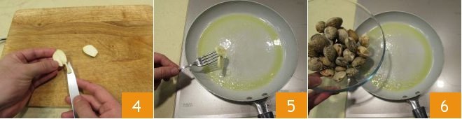 drizzle with white wine 7 and cover with a lid 8, letting them cook until completely opened 9.