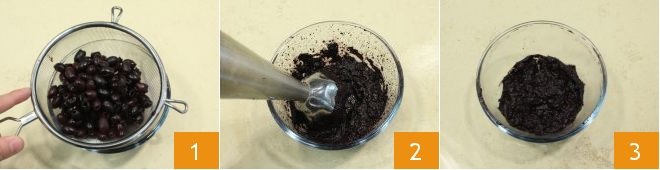 To prepare spaghetti alla chitarra with black olive sauce, asparagus, and bacon, drain the olives 1 and blend them with 70 g of their brine water until you obtain a cream 2 3.