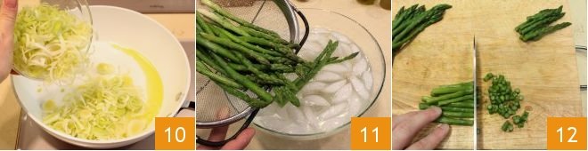 Put it to sauté gently in a saucepan with olive oil 10, it should wilt and not color. Once wilted, to prevent it from coloring, you can add a ladle of Vegetable broth. Remove the asparagus from the water to keep them crunchy and maintain their bright color, immediately immerse them in a bowl with ice water 11. Drain the asparagus, cut them into slices, taking care to set aside the tips for garnishing the dish 12.