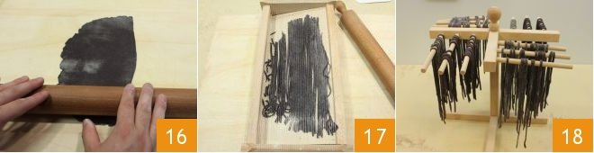 Now take the dough, work it a piece at a time, about 150 g in weight (taking care to wrap the remaining dough with plastic wrap to prevent it from drying), and roll out the dough by hand with a rolling pin 16 or with a machine for rolling out the dough from the thickest to the thinnest setting (about 1-2 mm). The size of the dough should be rectangular and should rest on the tool without hanging over. Pass the dough through the chitarra to obtain the spaghetti 17, as you cut the spaghetti, you can lay them on a floured tray or the appropriate pasta dryer 18.