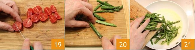 which will prevent them from sticking. Wash and cut the cherry tomatoes into quarters 19, cut the asparagus tips in half 20, and set them aside. Heat a drizzle of olive oil in a pan, add the asparagus tips 21.