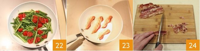 and the cherry tomatoes 22, sauté them for a couple of minutes, season with salt and pepper. Dry the bacon slices in the pan until they become crispy 23 then cut them into pieces 24.