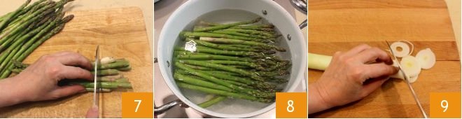 How to clean asparagus by removing the tougher final part of the stem 7 and boil them in boiling water 8 for 4-5 minutes with the lid on. Thinly slice the leek 9.