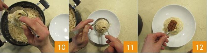Now everything is ready, you can plate it. Using a ladle and tongs, create a nest of spaghetti, twirling them 10 and transferring it onto the plate 11. Place a spoonful of sea urchin ragù on top 12