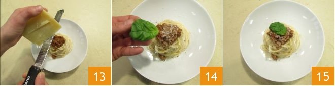 and with a microplane (or a regular grater), grate some Tuscan pecorino on top 13. Decorate with a grind of Sarawak black pepper, a drizzle of oil, and two basil leaves 14. The spaghetti with ragù and sea urchins is ready 15, serve it immediately!