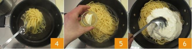 Drain the pasta when there are a couple of minutes left to the end of cooking and transfer it directly into the pan with the pepper infusion 4. Then add the butter 5 and the pecorino fondue 6, then mix and toss everything.