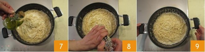 Add a drizzle of oil 7, a grind of Sarawak black pepper 8, and toss the pasta for 1-2 minutes 9.