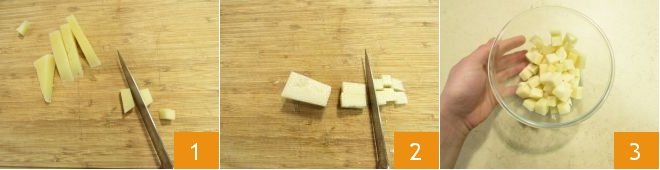 To prepare the spaghetti with cheese, pepper, and sea urchins, the first thing you need to do is make the pecorino fondue. Take the Tuscan pecorino and cut it into cubes of about 3/4 inch on each side 1, then do the same with the Romano pecorino 2. The cubes don’t need to be perfectly identical, but the more uniform they are, the better they will melt in the milk. Transfer both into a bowl and set aside 3.