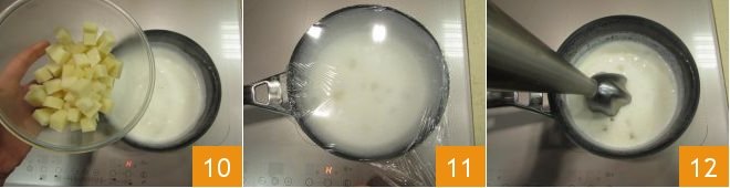 Continue cooking for about 1 minute while stirring, then add the pecorino cubes 10. Now you can turn off the heat and cover the saucepan with plastic wrap 11; let it infuse for about 5 minutes. After this time, blend the mixture with an immersion blender 12 until you obtain a smooth and homogeneous fondue. The consistency will be rather liquid; you will need to wait for the starches to work to make it creamier and thicker.