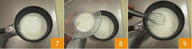 Pour the remaining 1 1/4 cups of milk into a saucepan and bring it to a boil 7. Only at this point can you add the cornstarch diluted in the milk to the saucepan 8, stirring quickly with a whisk 9.