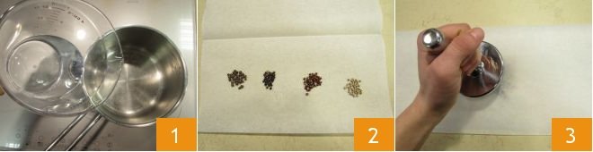 Prepare the pepper infusion by pouring the water into a saucepan 1 and setting it on high heat. Then, on a cutting board, place a sheet of parchment paper and pour the four types of pepper into the center 2. Fold the sheet to cover them and use a meat tenderizer to crush them 3.
