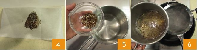 You will get a pepper mignonette 4, which will have a greater intensity than the whole grain. Then pour them into the water 5 and let them infuse for about 1 minute. Strain everything into a large pan (or a wide skillet), where you will later toss the pasta 6.