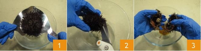 Proceed to prepare the sea urchin ragù. First, open the sea urchins with the appropriate tool 1. If you don't have the specific tool to open sea urchins, you can use scissors, but in this case, you shouldn't cut the sea urchin horizontally. Insert the scissors into the small hole at the base of the sea urchin 2 since the concave part is softer and does not require strong pressure. Divide the sea urchin into two 3. Since water will come out when opening the sea urchin, we recommend doing this operation over a bowl.
