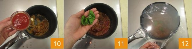 Add the tomato sauce 10 and 3 or 4 basil leaves 11. Stir for no more than 15-20 seconds; it just needs to warm slightly. At this point, turn off the heat and cover with plastic wrap; set aside 12.