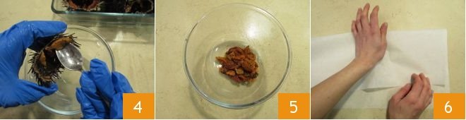At this point, using a teaspoon or a fork, scoop out only the red part 4, avoiding the black part, and transfer it to a small bowl. Continue this way for all the sea urchins 5. Once you have cleaned all the sea urchins, crush the clove of garlic in its skin by placing it between a sheet of parchment paper and applying gentle pressure with your hands 6.