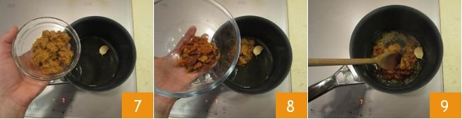 Pour a drizzle of oil into a saucepan, add the garlic, and let the oil become fragrant for a moment. First, add the pasteurized sea urchins 7, then the fresh ones 8, stir 9, and reduce the heat to the minimum.