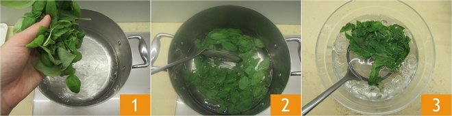 To prepare the spaghetti parmesan with cherry tomato coulis, first make the basil butter which will be used for creaming. Put a pot full of water on the fire, salt it at 10%, and bring it to a boil. Immerse the basil leaves 1, blanch them for 30 seconds 2 then using a slotted spoon, drain them and transfer them to ice water 3. This step is to stop the cooking and keep the leaves’ color bright.